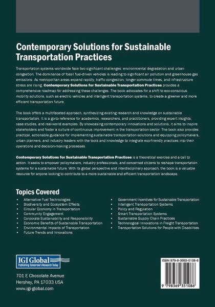 Transportation systems worldwide face two significant challenges: environmental degradation and urban congestion. The dominance of fossil fuel-driven vehicles is leading to significant air pollution and greenhouse gas emissions. As metropolitan areas expand rapidly, traffic congestion, longer commute times, and infrastructure stress are rising. Contemporary Solutions for Sustainable Transportation Practices provides a comprehensive roadmap for addressing these challenges. The book advocates for a shift to eco-conscious mobility solutions, such as electric vehicles and intelligent transportation systems, to create a greener and more efficient transportation future. The book offers a multifaceted approach, synthesizing existing research and knowledge on sustainable transportation. It is a go-to reference for academics, researchers, and practitioners, providing expert insights, case studies, and real-world examples. By showcasing contemporary innovations and solutions, it aims to inspire stakeholders and foster a culture of continuous improvement in the transportation sector. The book also provides practical, actionable guidance for implementing sustainable transportation solutions and equipping policymakers, urban planners, and industry leaders with the tools and knowledge to integrate eco-friendly practices into their operations and decision-making processes.