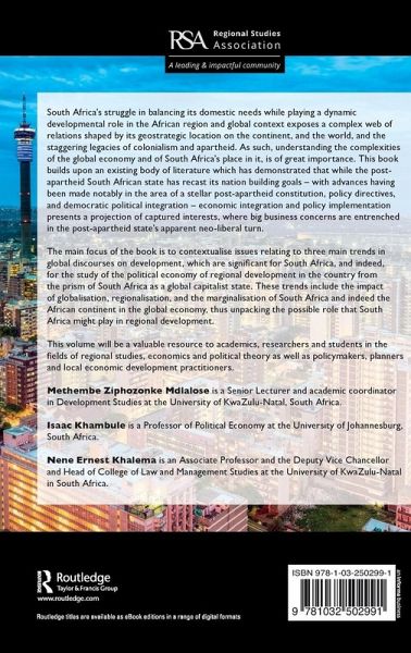 South Africa's struggle in balancing its domestic needs while playing a dynamic developmental role in the African region and global context exposes a complex web of relations shaped by its geostrategic location on the continent, and the world, and the staggering legacies of colonialism and apartheid. As such, understanding the complexities of the global economy and of South Africa's place in it, is of great importance. This book builds upon an existing body of literature which has demonstrated that while the post-apartheid South African state has recast its nation building goals - with advances having been made notably in the area of a stellar post-apartheid constitution, policy directives, and democratic political integration - economic integration and policy implementation presents a projection of captured interests, where big business concerns are entrenched in the post-apartheid state's apparent neo-liberal turn.