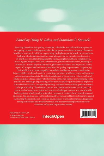 Ensuring the delivery of quality, accessible, affordable, and safe healthcare presents an ongoing complex challenge crucial to the progression and advancement of modern healthcare systems. In addition to providing the highest quality health care to patients, healthcare leadership and systems must also provide for the safety and security of healthcare providers throughout the entire, complex healthcare conglomerate, including pre-hospital providers, pharmacists, patient care technicians, radiological technicians, nurses, physical therapists, physician extenders, and physicians. Every aspect of care provided merits consideration for quality improvement, augmenting clinical efficiency, promoting effective, efficient collaboration and coordination between different clinical services, curtailing exorbitant healthcare costs, and boosting patient and provider safety. This third installment of Contemporary Topics in Patient Safety examines a broad variety of interrelated connected themes corresponding to the benefits and challenges of providing safety-focused quality patient care via improved clinical infrastructure, conceptual planning, symbiotic team-building enhancements, and sage leadership. The elements, issues, and dilemmas discussed in this textbook pertain to both resource-replete and resource-challenged nations, and to worldwide health systems, which develop uniquely in response to unique, local conundrums and dilemmas. Topics discussed in this volume address the central factors of identifying and facilitating the promotion of continual advancement of clinical routines and regimens among individuals and medical teams as well as institutional practices towards enhanced safety and improved outcomes.