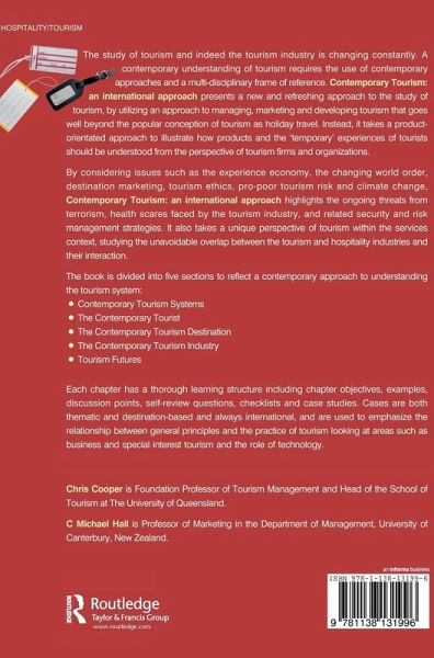 The study of tourism and indeed the tourism industry is changing constantly. Contemporary Tourism: an international approach presents a new and refreshing approach to the study of tourism, considering issues such as the changing world order, destination marketing, tourism ethics and pro-poor tourism. In particular, it highlights the ongoing threats from terrorism and health scares faced by the tourism industry today, and discusses the related security and risk management strategies, illustrating the potential implications for the patterns and flow of tourism in the future. Divided into five sections, each chapter has a thorough learning structure including chapter objectives, examples, discussion points, self review questions, checklists and case studies. Cases will be both thematic and destination-based and always international. They will be used to emphasise the relationship between general principles and the practice of tourism looking at areas such as business and special interest tourism and the role of technology.The five sections will cover: Contemporary Tourism Systems; The Contemporary Tourist; The Contemporary Tourist Destination; Tourism Futures; Teaching and Studying Contemporary Tourism. The text will also provide an annotated, authoritative and thorough set of resources to guide the reader through the topic area including online resource sites for both students and lecturers.
