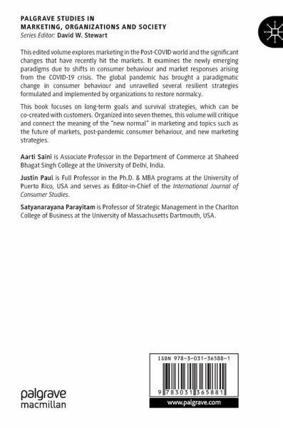 This edited volume explores marketing in the Post-COVID world and the significant changes that have recently hit the markets. It examines the newly emerging paradigms due to shifts in consumer behaviour and market responses arising from the COVID-19 crisis.