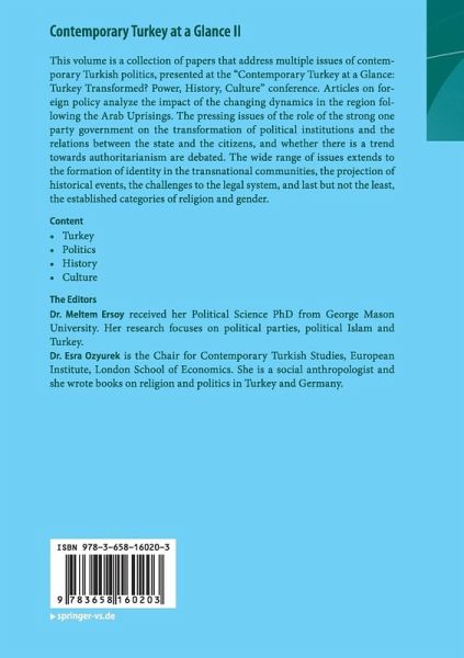 This volume is a collection of papers that address multiple issues of contemporary Turkish politics, presented at the "Contemporary Turkey at a Glance: Turkey Transformed? Power, History, Culture" conference. Articles on foreign policy analyze the impact of the changing dynamics in the region following the Arab Uprisings. The pressing issues of the role of the strong one party government on the transformation of political institutions and the relations between the state and the citizens, and whether there is a trend towards authoritarianism are debated. The wide range of issues extends to the formation of identity in the transnational communities, the projection of historical events, the challenges to the legal system, and last but not the least, the established categories of religion and gender.