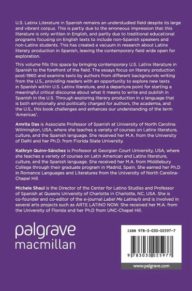 1. U.S. Latinx Literature in Spanish: Claiming its Rightful Place; Amrita Das, Kathryn Quinn-Sánchez Michele Shaul.- 2. Rethinking the Lens of Spanish: Grounding a Chicana Feminist Language; Elena Avilés.- 3. Self-Representation and the Dual Reality of Identity in the Spanish-language Poetry of Javier O. Huerta; Donna M. Kabalen de Bichara.- 4. Two Narratives of Memories Between Borders: Flourishing of a Transnational Identity; Cynthia Meléndrez.- 5. Untangling Literary Knots: Writing, Memory, and Identity in Sonia Rivera-Valdés' Rosas de Abolengo (2011); María Celina Bortolotto.- 6. When Whiteness Means Imagining Blackness and Signifying Socio-Cultural Difference; JM. Persánch.- 7. The Rise of Latino Americanism: Deterritorialization and Postnational Imagination in Joseph Avski, Yuri Herrera, Claudia Salazar Jiménez, and Luis Marcelino Gómez; Francisco Laguna-Correa.- 8. Conclusion: Continuing the Dialogue; Amrita Das, Kathryn Quinn-Sánchez Michele Shaul.