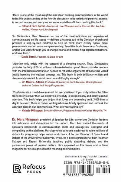 How did intentionally killing human beings in the womb become "health care"? When did sacrificing the innocent become the path to "freedom"? Planned Parenthood and their allies are normalizing abortion and selling a lie. In Contenders, Dr. Marc Newman shows you the spiritual underpinnings of the abortion industry and how its advocates "argue in retreat." With every shift in the conversation, you will learn how to winsomely respond to abortion-choice supporters and help them to see that their view of the unborn is not only scientifically insupportable, but morally disfiguring, placing all human beings at risk. Drawing on decades as a nationally-recognized pro-life communication trainer, apologist, professor, and director of intercollegiate speech and debate, Newman equips readers to:Strip the mask off of abortion Understand why the church has remained so silent Recognize and defeat abortion advocate's Five Big Shifts Give you confidence to speak up for the unborn Become powerfully persuasive while remaining winsome Combat a culture of death by creating tangible, life-affirming alternatives Empower Christians to change the world