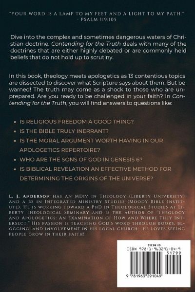 What happens when God's people stop contending for the truth? In a world where confusion is often mistaken for compassion, and doctrinal compromise is praised as unity, Christians must not only believe the truth, they must be equipped to defend it. Contending for the Truth explores thirteen highly debated doctrines in Christianity today, applying biblical rigor to each and calling believers to stand firm on Scripture. From apologetics to creationism, church discipline to the doctrine of inerrancy, this book walks readers through contentious topics with clarity and conviction. Each chapter grounds its arguments in Scripture, compares doctrinal views, and invites readers to test everything against the Word of God, not tradition, consensus, or culture. Whether used for personal study, classroom engagement, or group discussion, this book will help readers:Identify theological drift in today's church Compare key doctrines against Scripture itself Engage contentious issues with clarity and confidence Contend for the faith with humility and courage This is not a primer on the basics of the faith. It's a theological sharpening stone for those seeking to grow, think, and live more biblically. Written by L. J. Anderson, author, independent scholar, and founder of Lamad Press, Contending for the Truth serves as a companion volume to his earlier work, Theology and Apologetics, applying that foundational method to real-world doctrinal challenges. Anderson holds a Master of Divinity, is pursuing a PhD in theological studies, and publishes accessible, academically grounded works for pastors, students, and lay leaders alike. If you're ready to think deeply, study biblically, and live faithfully, this book will challenge and equip you. Contents IntroductionWhy God? The Moral Argument Truth The Inerrancy of Scripture Gnosticism: A Biblical and Historical Response Biblical Forgiveness Biblical Church Discipline Is Christianity a Religion or a Relationship? Religious Freedom Scientific Naturalism v Creationism Young Earth v Old Earth Creationism Sons of God The Doctrine of Election A Brief Call to Action Also by L. J. Anderson Bibliography