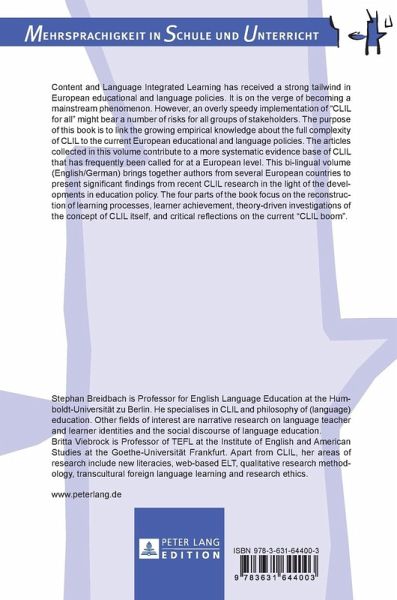 Content and Language Integrated Learning has received a strong tailwind in European educational and language policies. It is on the verge of becoming a mainstream phenomenon. However, an overly speedy implementation of "CLIL for all" might bear a number of risks for all groups of stakeholders. The purpose of this book is to link the growing empirical knowledge about the full complexity of CLIL to the current European educational and language policies. The articles collected in this volume contribute to a more systematic evidence base of CLIL that has frequently been called for at a European level. This bi-lingual volume (English/German) brings together authors from several European countries to present significant findings from recent CLIL research in the light of the developments in education policy. The four parts of the book focus on the reconstruction of learning processes, learner achievement, theory-driven investigations of the concept of CLIL itself, and critical reflections on the current "CLIL boom".