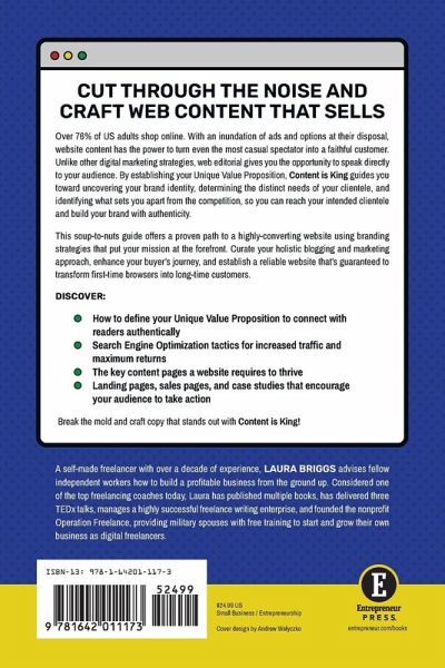 Introduction Chapter 1: Website Writing 101 Chapter 2: Website Basics and How to Write Them Chapter 3: Defining Your Unique Value Proposition Chapter 4: Writing Copy: Best Practices and Brand Guidelines Chapter 5: Understanding Your Buyer's Journey Chapter 6: Outlining and Drafting Your Website Copy Chapter 7: SEO: Optimizing Website Content Chapter 8: From Website to Content Marketing Strategy Chapter 9: Blogging Basics Chapter 10: Advanced Blogging Chapter 11: Marketing Outreach: Other Content Chapter 12: Outsourcing: Hiring Other Professionals Final Thoughts About the Author Index