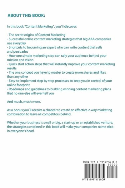 If you want to create content like BuzzFeed that turns a simple click into a money making sale for your business, then keep reading… Did you know, in just the first 60 seconds of your day... 87,500 tweets are posted on Twitter 3.8 Million Google searches are typed 1 Million people are logging into Facebook That¿s how big content is being consumed each minute every single day of people¿s lives. As the saying goes: "Content is King." Now the big question is how can you leverage content to make people buy from you? This is where the newest marketing approach known as Content Marketing comes in. Content Marketing uses strategic planning and posting content that sells and engages your audience which spells the difference between customer retention and missed sales. All you need to know is how to shoot your message like an arrow that your audience can¿t take off their chest. Gary Vee breaks it down: "You need to spend all of your time and energy on creating something that actually brings value to the people you're asking for money!" According to Pew Research, 77% of US Adults go online daily. This means you can reach 77% of a whole nation in one day… if you know how. It is time to discover the right roadmap to present your content and get the exposure you need to turn even a farmers shop into a worldwide company like Whole Foods Market. Author Gavin Turner knows what your audience wants and soon you will, too. In this complete step-by-step guide, Content Marketing: Proven Strategies to Attract an Engaged Audience Online with Great Content and Social Media to Win More Customers, Build your Brand and Boost your Business, you will discover: Successful online content marketing strategies that big AAA companies use everyday How one simple marketing step can rally your audience behind your mission and vision Shortcuts to becoming an expert who can write content that sells and persuades Quick start action steps that will instantly improve your content marketing results The one concept you have to master to create more shares and likes than any other Easy-to-implement step by step processes to keep you in control of your online footprint Roadmaps and guidelines to building winning content marketing plans that no one else will ever tell you …and much, much more! Added BONUSES: - Bonus 1: Includes a Bonus Chapter on how to create an effective 2-way marketing combination to leave all competitors behind - Bonus 2: Book preview on how to effectively promote your content on online platforms being used by more than 3 billion people Whether your business is small or big, a start-up or an established venture, the strategies contained in this book will make your companies name stick in everyone's head. Content marketing is the only marketing type for everyone. All it requires is your personal DNA, passion and a message to share. Scroll up and click the "Buy Now" button to instantly increase your sales by choosing the right content for your customer.