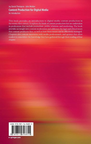 This book provides an introduction to digital media content production in the twenty-first century. It explores the kinds of content production that are undertaken in professions that include journalism, public relations and marketing. The book provides an insight into content moderation and addresses the legal and ethical issues that content producers face, as well as how these issues can be effectively managed. Chapters also contain interviews with media professionals, and quizzes that allow readers to consolidate the knowledge they have gathered through their reading of that chapter.