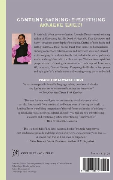 Akwaeke Emezi (they/them) is the author of the New York Times bestseller The Death of Vivek Oji, which was a finalist for the Dylan Thomas Prize, the Los Angeles Times Book Prize, and the PEN/Jean Stein Award; Pet, a finalist for the National Book Award for Young People's Literature, a Walter Honor Book, and a Stonewall Honor Book; Freshwater, which was named a New York Times Notable Book and shortlisted for the PEN/Hemingway Award, the New York Public Library Young Lions Fiction Award, the Lambda Literary Award, and the Center for Fiction's First Novel Prize; and most recently, Dear Senthuran: A Black Spirit Memoir. Their debut poetry collection, Content Warning: Everything, their debut romance novel, You Made a Fool of Death with Your Beauty, and their next young adult novel, Bitter, are forthcoming in 2022. Selected as a 5 Under 35 honoree by the National Book Foundation, they are based in liminal spaces.