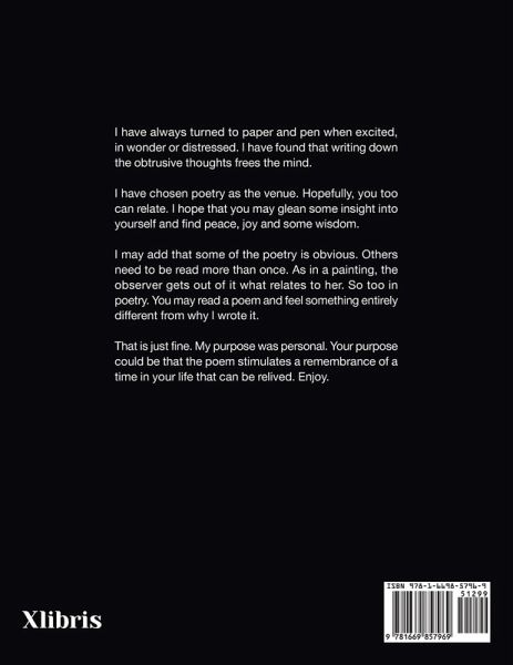 I have always turned to paper and pen when excited, in wonder or distressed. I have found that writing down the obtrusive thoughts frees the mind. I have chosen poetry as the venue. Hopefully, you too can relate. I hope that you may glean some insight into yourself and find peace, joy and some wisdom. I may add that some of the poetry is obvious. Others need to be read more than once. As in a painting, the observer gets out of it what relates to her. So too in poetry. You may read a poem and feel something entirely different from why I wrote it. That is just fine. My purpose was personal. Your purpose could be that the poem stimulates a remembrance of a time in your life that can be relived. Enjoy.