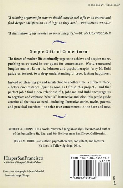 Simple Gifts of Contentment The forces of modern life urge us to achieve and acquire more, pushing us outward in our quest for contentment. World-renowned Jungian analyst Robert A. Johnson and psychotherapist Jerry M. Ruhl guide us inward, to a deep understanding of true, lasting happiness. Instead of relegating joy and satisfaction to another time, a different place, a better circumstance ("just as soon as I finish this project / land that perfect job / find a new relationship"), Johnson and Ruhl encourage us to negotiate and embrace "what is." Instructive and wise, this gentle guide contains all the tools we need--including illustrative stories, myths, poems, and practical exercises--to seize true contentment in the here and now.