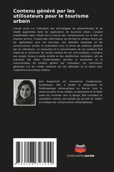 L'étude porte sur l'utilisation des technologies de géolocalisation et de réalité augmentée dans les applications de tourisme urbain. L'aspect problématisé dans l'étude est la source des connaissances sur la ville, en d'autres termes, l'origine des informations qui forment le contenu fourni par les applications pour les touristes. Les données localisées et les connaissances locales se présentent sous la forme de contenus générés par les utilisateurs. La production et la consommation de ces contenus font l'objet de la recherche. Un certain nombre de cas sont analysés, y compris des projets locaux à petite échelle et des plateformes mondiales, afin de présenter les idées fondamentales derrière la production et la consommation de contenu généré par l'utilisateur, les conclusions générales sur les modes existants de son utilisation et sa valeur pour l'expérience touristique urbaine.