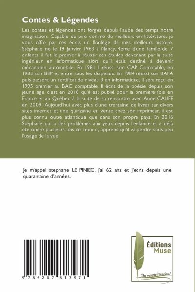 Les contes et légendes ont forgés depuis l'aube des temps notre imagination. Capable du pire comme du meilleurs en littérature, je vous offre par ces écrits un florilège de mes meilleurs histoire. Stéphane né le 19 Janvier 1963 à Nancy, 4ème d'une famille de 7 enfants, il fut le premier à réussir ces études devenant par la suite ingénieur en informatique alors qu'il était destiné à devenir mécanicien automobile. En 1981 il réussi son CAP Comptable, en 1983 son BEP et entre sous les drapeaux. En 1984 réussi son BAFA puis passera un certificat de niveau 3 en informatique, il sera reçu en 1995 premier au BAC comptable. Il écrit de la poésie depuis son jeune âge c'est en 2010 qu'il est publié pour la première fois en France et au Québec à la suite de sa rencontre avec Anne CALIFE en 2009. Aujourd'hui avec plus d'une trentaine de livres sur divers sites internet et une quinzaine en vente chez son imprimeur, il est plus connu outre atlantique que dans son propre pays. En 2016 Stéphane qui a des problèmes aux yeux depuis l'enfance et a déjà été opéré plusieurs fois de ceux-ci, apprend qu'il va perdre sous peu l'usage de la vue.