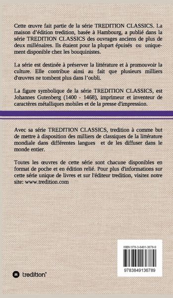 Cette uvre (édition relié) fait partie de la série TREDITION CLASSICS. La maison d édition tredition, basée à Hambourg, a publié dans la série TREDITION CLASSICS des ouvrages anciens de plus de deux millénaires. Ils étaient pour la plupart épuisés ou uniquement disponible chez les bouquinistes. La série est destinée à préserver la littérature et à promouvoir la culture. Avec sa série TREDITION CLASSICS, tredition à comme but de mettre à disposition des milliers de classiques de la littérature mondiale dans différentes langues et de les diffuser dans le monde entier.