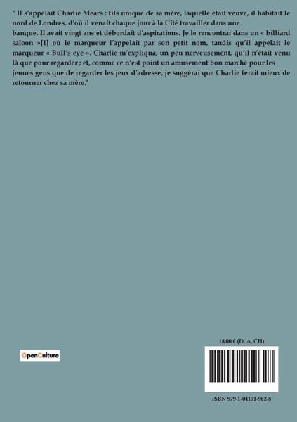 " Il s¿appelait Charlie Mears ; fils unique de sa mère, laquelle était veuve, il habitait le nord de Londres, d¿où il venait chaque jour à la Cité travailler dans une banque. Il avait vingt ans et débordait d¿aspirations. Je le rencontrai dans un « billiard saloon »[1] où le marqueur l¿appelait par son petit nom, tandis qüil appelait le marqueur « Bull¿s eye ». Charlie m¿expliqua, un peu nerveusement, qüil n¿était venu là que pour regarder ; et, comme ce n¿est point un amusement bon marché pour les jeunes gens que de regarder les jeux d¿adresse, je suggérai que Charlie ferait mieux de retourner chez sa mère."