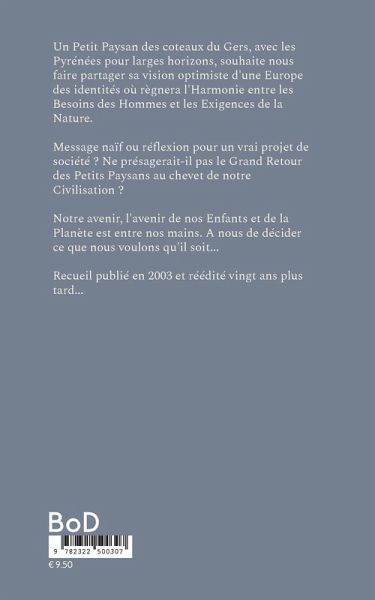 Petit Paysan du Gers en Occitanie, passionné de prospective, l'auteur s'est intéressé très tôt à l'agriculture biologique, à l'avenir de la ruralité et de la société en général. N'ayant pas le verbe assez haut pour défendre ses idées, durant des décennies il a écrit des petits textes rassemblés sur ce recueil. En leur temps, certains avaient été publiés dans la presse locale. En 2023, un pied en Occitanie et l'autre en Lettonie où il a vécu quelques années en mission pour une ONG, il continue de plus belle. AD VITAM ÆTERNAM est un roman fantastique occitano-letton en plusieurs tomes. Il prône la Réincarnation de la Petite Paysannerie au chevet de notre Civilisation.