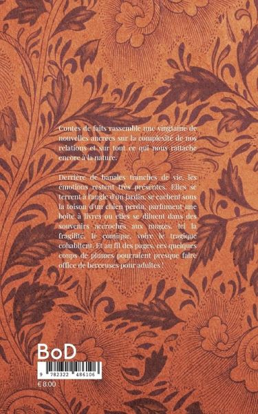 Contes de faits rassemble une vingtaine de nouvelles ancrées sur la complexité de nos relations et sur tout ce qui nous rattache encore à la nature. Derrière des regards posés sur de banales situations du quotidien, les émotions restent omniprésentes. Elles se terrent à l'angle d'un jardin, se cachent sous la toison d'un chien perdu, parfument une boîte à livres ou elles se diluent dans des souvenirs accrochés aux nuages. Car ici la fragilité, le comique, voire le tragique cohabitent.Et au fil des pages, ces quelques coups de plumes, liés à certaines tranches de vie pourraient presque faire office de berceuses pour adultes !