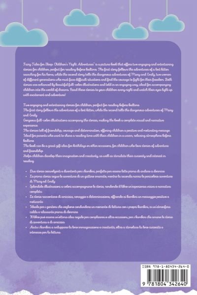 Contes de fées pour le sommeil : Children's Night Adventures" est un livre d'images qui propose aux enfants deux histoires captivantes et divertissantes à lire avant de se coucher. La première histoire suit les aventures d'un chaton perdu à la recherche de sa maison, tandis que la seconde suit les dangereuses aventures de Mary et Emily, deux femmes de générations différentes qui doivent faire face à des situations difficiles et trouver le courage de se battre pour leur liberté. Les deux histoires sont agrémentées de magnifiques illustrations en couleurs et racontées de manière captivante, idéale pour accompagner les enfants dans le monde des rêves. Lisez ces histoires à vos enfants chaque soir et regardez leurs yeux s'illuminer d'excitation et d'aventure ! Deux histoires captivantes et divertissantes pour les enfants, parfaites pour être lues avant le coucher. La première histoire raconte les aventures d'un chaton perdu, tandis que la seconde suit les dangereuses aventures de Mary et Emily. De magnifiques illustrations en couleurs accompagnent les histoires, faisant de ce livre une expérience visuelle et narrative complète. Les histoires parlent d'amitié, de courage et de détermination, offrant aux enfants un message positif et motivant. Idéal pour les parents qui souhaitent partager un moment de lecture avec leurs enfants dans une atmosphère chaleureuse et relaxante avant le coucher. Ce livre peut être une excellente idée de cadeau pour les anniversaires ou d'autres occasions, pour les enfants qui aiment les histoires d'aventure et d'amitié. Aide les enfants à développer leur imagination et leur créativité, ainsi qu'à stimuler leur curiosité et leur intérêt pour la lecture. La première histoire raconte les aventures d'un petit chat, tandis que la seconde raconte les aventures périlleuses de Mary et Emily. De magnifiques illustrations en couleur accompagnent les histoires, faisant du livre une expérience visuelle et narrative complète. Les histoires parlent d'amitié, de courage et de détermination, offrant aux enfants un message positif et motivant. Idéal pour les parents qui souhaitent partager un moment de lecture avec leurs enfants dans une atmosphère calme et relaxante avant le coucher. Le livre peut être une excellente idée de cadeau pour les fêtes ou d'autres occasions, pour les enfants qui aiment les histoires d'aventure et d'amitié. Aide les enfants à développer leur imagination et leur créativité, et stimule leur curiosité et leur intérêt pour la littérature.