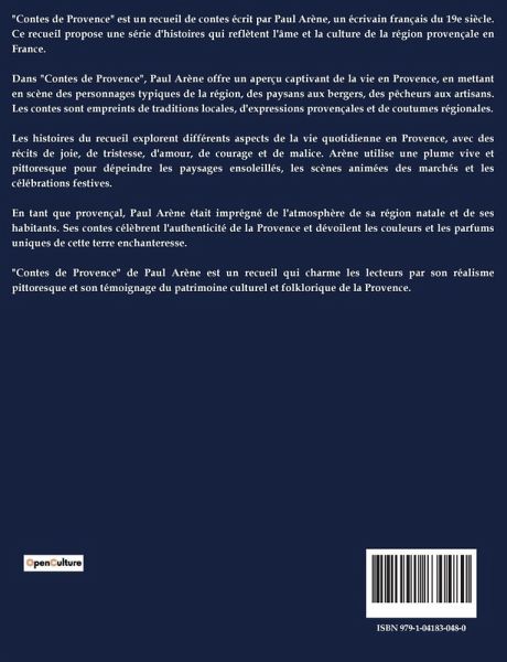 "Contes de Provence" est un recueil de contes écrit par Paul Arène, un écrivain français du 19e siècle. Ce recueil propose une série d'histoires qui reflètent l'âme et la culture de la région provençale en France. Dans "Contes de Provence", Paul Arène offre un aperçu captivant de la vie en Provence, en mettant en scène des personnages typiques de la région, des paysans aux bergers, des pêcheurs aux artisans. Les contes sont empreints de traditions locales, d'expressions provençales et de coutumes régionales. Les histoires du recueil explorent différents aspects de la vie quotidienne en Provence, avec des récits de joie, de tristesse, d'amour, de courage et de malice. Arène utilise une plume vive et pittoresque pour dépeindre les paysages ensoleillés, les scènes animées des marchés et les célébrations festives. En tant que provençal, Paul Arène était imprégné de l'atmosphère de sa région natale et de ses habitants. Ses contes célèbrent l'authenticité de la Provence et dévoilent les couleurs et les parfums uniques de cette terre enchanteresse. "Contes de Provence" de Paul Arène est un recueil qui charme les lecteurs par son réalisme pittoresque et son témoignage du patrimoine culturel et folklorique de la Provence.