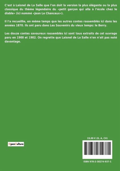 C¿est à Laisnel de La Salle que l¿on doit la version la plus élégante ou la plus classique du thème légendaire du «petit garçon qui alla à l¿école chez le diable» (ici nommé «Jean Le Chanceux»). Il l¿a recueillie, en même temps que les autres contes rassemblés ici dans les années 1870. Ils ont paru dans Les Souvenirs du vieux temps: le Berry. Les douze contes savoureux rassemblés ici sont tous extraits de cet ouvrage paru en 1900 et 1902. On regrette que Laisnel de La Salle n¿en n¿ait pas noté davantage.
