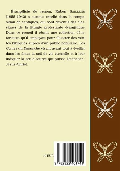 Évangéliste de renom, Ruben Saillens (1855-1942) a surtout excellé dans la composition de cantiques, qui sont devenus des classiques de la liturgie protestante évangélique. Dans ce recueil il réunit une collection d'historiettes qu'il employait pour illustrer des vérités bibliques auprès d'un public populaire. Les Contes du Dimanche visent avant tout à éveiller dans les âmes la soif de vie éternelle et à leur indiquer la seule source qui puisse l'étancher : Jésus-Christ. Cette édition ThéoTeX reproduit celle de 1904.