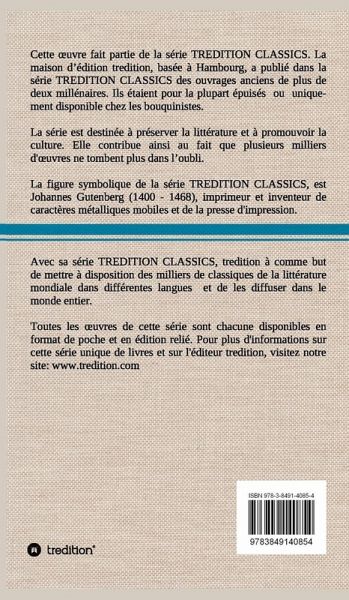Cette uvre (édition relié) fait partie de la série TREDITION CLASSICS. La maison d édition tredition, basée à Hambourg, a publié dans la série TREDITION CLASSICS des ouvrages anciens de plus de deux millénaires. Ils étaient pour la plupart épuisés ou uniquement disponible chez les bouquinistes. La série est destinée à préserver la littérature et à promouvoir la culture. Avec sa série TREDITION CLASSICS, tredition à comme but de mettre à disposition des milliers de classiques de la littérature mondiale dans différentes langues et de les diffuser dans le monde entier.