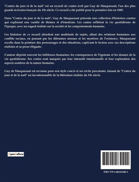"Contes du jour et de la nuit" est un recueil de contes écrit par Guy de Maupassant, l'un des plus grands écrivains français du 19e siècle. Ce recueil a été publié pour la première fois en 1885. Dans "Contes du jour et de la nuit", Guy de Maupassant présente une collection d'histoires courtes qui explorent une variété de thèmes et d'émotions. Les contes reflètent la vie quotidienne de l'époque, avec un regard réaliste sur la société et les comportements humains. Les histoires de ce recueil abordent une multitude de sujets, allant des relations humaines aux conflits sociaux, en passant par les dilemmes moraux et les mystères de l'existence. Maupassant excelle dans la peinture des personnages et des situations, captivant le lecteur avec ses descriptions réalistes et sa prose élégante. L'auteur dépeint souvent les faiblesses humaines, les conséquences de l'égoïsme et les drames de la vie quotidienne. Ses contes sont marqués par leur intensité émotionnelle et leur exploration des aspects sombres de la nature humaine. Guy de Maupassant est reconnu pour son style concis et ses récits percutants, faisant de "Contes du jour et de la nuit" un incontournable de la littérature réaliste du 19e siècle.