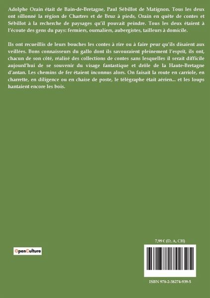 Adolphe Orain était de Bain-de-Bretagne, Paul Sébillot de Matignon. Tous les deux ont sillonné la région de Chartres et de Bruz à pieds, Orain en quête de contes et Sébillot à la recherche de paysages qüil pouvait peindre. Tous les deux étaient à l¿écoute des gens du pays: fermiers, ournaliers, aubergistes, tailleurs à domicile. Ils ont recueillis de leurs bouches les contes à rire ou à faire peur qüils disaient aux veillées. Bons connaisseurs du gallo dont ils savouraient pleinement l¿esprit, ils ont, chacun de son côté, réalisé des collections de contes sans lesquelles il serait difficile aujourd¿hui de se souvenir du visage fantastique et drôle de la Haute-Bretagne d¿antan. Les chemins de fer étaient inconnus alors. On faisait la route en carriole, en charrette, en diligence ou en chaise de poste, le télégraphe était aérien... et les loups hantaient encore les bois.