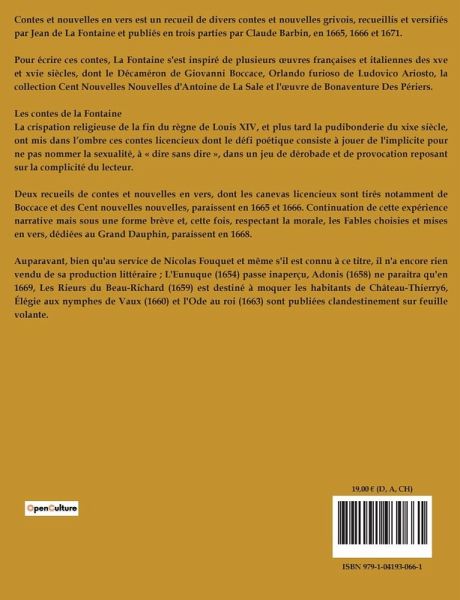 Contes et nouvelles en vers est un recueil de divers contes et nouvelles grivois, recueillis et versifiés par Jean de La Fontaine et publiés en trois parties par Claude Barbin, en 1665, 1666 et 1671. Pour écrire ces contes, La Fontaine s'est inspiré de plusieurs ¿uvres françaises et italiennes des xve et xvie siècles, dont le Décaméron de Giovanni Boccace, Orlando furioso de Ludovico Ariosto, la collection Cent Nouvelles Nouvelles d'Antoine de La Sale et l'¿uvre de Bonaventure Des Périers. Les contes de la Fontaine La crispation religieuse de la fin du règne de Louis XIV, et plus tard la…mehr