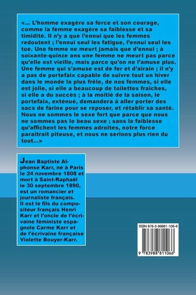 ... L'homme exagère sa force et son courage, comme la femme exagère sa faiblesse et sa timidité. Il n'y a que l'ennui que les femmes redoutent ; l'ennui seul les fatigue, l'ennui seul les tue. Une femme ne meurt jamais que d'ennui ; à soixante-quinze ans une femme ne meurt pas parce qu'elle est vieille, mais parce qu'on ne l'amuse plus. Une femme qui s'amuse est de fer et d'airain ; il n'y a pas de portefaix capable de suivre tout un hiver dans le monde la plus frêle, de nos femmes, si elle est jolie, si elle a beaucoup de toilettes fraîches, si elle a du succès ; à la moitié de la saison, le portefaix, exténué, demandera à aller porter des sacs de farine pour se reposer, et rétablir sa santé. Nous ne sommes le sexe fort que parce que nous ne sommes pas le beau sexe ; sans la faiblesse qu'affichent les femmes adroites, notre force paraîtrait piteuse, et nous ne serions plus rien du tout...