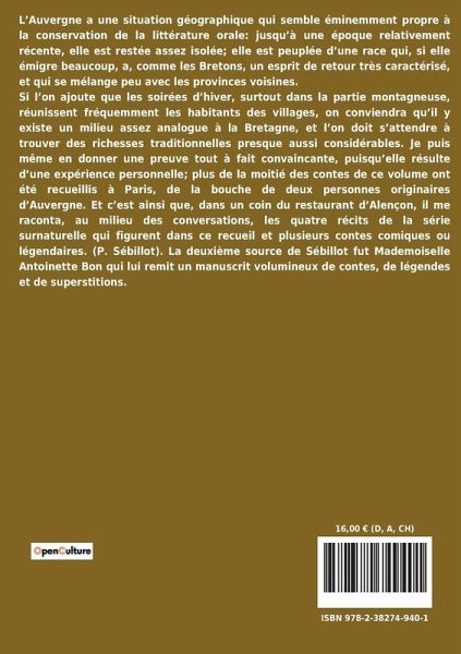 L¿Auvergne a une situation géographique qui semble éminemment propre à la conservation de la littérature orale: jusqüà une époque relativement récente, elle est restée assez isolée; elle est peuplée d¿une race qui, si elle émigre beaucoup, a, comme les Bretons, un esprit de retour très caractérisé, et qui se mélange peu avec les provinces voisines. Si l¿on ajoute que les soirées d¿hiver, surtout dans la partie montagneuse, réunissent fréquemment les habitants des villages, on conviendra qüil y existe un milieu assez analogue à la Bretagne, et l¿on doit s¿attendre à trouver des richesses traditionnelles presque aussi considérables. Je puis même en donner une preuve tout à fait convaincante, puisqüelle résulte d¿une expérience personnelle; plus de la moitié des contes de ce volume ont été recueillis à Paris, de la bouche de deux personnes originaires d¿Auvergne. Et c¿est ainsi que, dans un coin du restaurant d¿Alençon, il me raconta, au milieu des conversations, les quatre récits de la série surnaturelle qui figurent dans ce recueil et plusieurs contes comiques ou légendaires. (P. Sébillot). La deuxième source de Sébillot fut Mademoiselle Antoinette Bon qui lui remit un manuscrit volumineux de contes, de légendes et de superstitions.