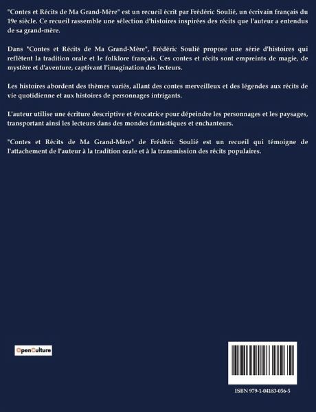 Les souvenirs d'une grand-mère se transforment en un voyage littéraire métamorphose à travers les récits de Frédéric Soulié. Dans ' Contes et Récits de ma Grandmère ', l'auteur nous plonge dans un univers où le passé et le présent se rencontrent, tissant des histoires qui oscillent entre le merveilleux et le quotidien. Situé dans la France du XIXe siècle, ce recueil de contes explore les traditions orales et les légendes populaires, offrant un aperçu précieux de la culture et des croyances de l'époque. Les récits, empreints de mystère et de sagesse, révèlent des personnages hauts en couleur, des situations cocasses et des morales intemporelles. À travers ces histoires, Soulié aborde des thèmes universels tels que l'amour, la ruse, la justice et la destinée. Chaque conte est une fenêtre ouverte sur un monde où les fées, les sorcières et les héros du quotidien se côtoient, créant un mélange envoûtant de réalisme et de fantastique. L'auteur, avec une plume élégante et précise, parvient à capturer l'essence de ces récits transmis de génération en génération, tout en y insufflant sa propre sensibilité littéraire. En lisant ces contes, le lecteur est invité à réfléchir sur les valeurs et les leçons de vie qui transcendent les époques. Ce livre nous offre une occasion de redécouvrir l'évolution du patrimoine oral français, tout en nous rappelant l'importance de la transmission des histoires et des savoirs. En explorant ces récits, nous sommes amenés à mieux comprendre les racines culturelles qui façonnent notre identité collective.