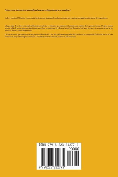Préparez-vous à découvrir un monde plein d'aventures et d'apprentissage avec vos enfants ! Ce livre contient 65 histoires courtes qui divertiront non seulement les enfants, mais qui leur enseigneront également des leçons de vie précieuses. Chaque page de ce livre est remplie d'illustrations colorées et vibrantes qui captiveront l'attention des enfants dès le premier instant. De plus, chaque histoire véhicule un message positif qui aidera les enfants à comprendre la valeur de l'amitié, de l'honnêteté, de la persévérance, de ne pas voler, de ne pas mentir et d'autres valeurs importantes. Ces histoires sont spécialement conçues pour les enfants de 4 à 7 ans, afin qu'ils puissent profiter des histoires et en comprendre facilement le sens. Si vous cherchez un moyen d'inculquer des valeurs à vos enfants tout en s'amusant, ce livre est fait pour vous.