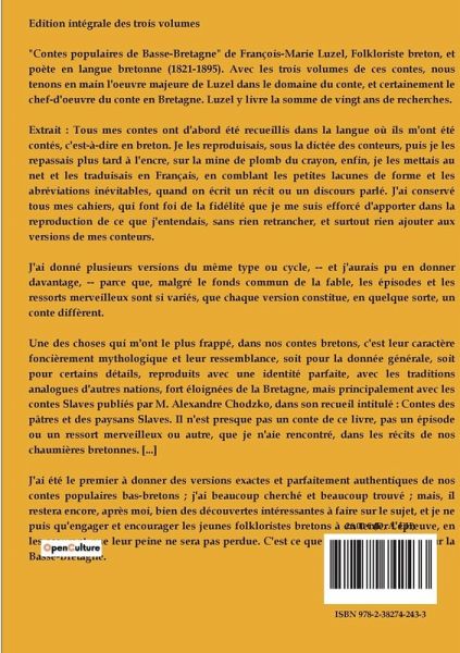Edition intégrale des trois volumes "Contes populaires de Basse-Bretagne" de François-Marie Luzel, Folkloriste breton, et poète en langue bretonne (1821-1895). Avec les trois volumes de ces contes, nous tenons en main l'oeuvre majeure de Luzel dans le domaine du conte, et certainement le chef-d'oeuvre du conte en Bretagne. Luzel y livre la somme de vingt ans de recherches. Extrait : Tous mes contes ont d'abord été recueillis dans la langue où ils m'ont été contés, c'est-à-dire en breton. Je les reproduisais, sous la dictée des conteurs, puis je les repassais plus tard à l'encre, sur la mine de plomb du crayon, enfin, je les mettais au net et les traduisais en Français, en comblant les petites lacunes de forme et les abréviations inévitables, quand on écrit un récit ou un discours parlé. J'ai conservé tous mes cahiers, qui font foi de la fidélité que je me suis efforcé d'apporter dans la reproduction de ce que j'entendais, sans rien retrancher, et surtout rien ajouter aux versions de mes conteurs. J'ai donné plusieurs versions du même type ou cycle, -- et j'aurais pu en donner davantage, -- parce que, malgré le fonds commun de la fable, les épisodes et les ressorts merveilleux sont si variés, que chaque version constitue, en quelque sorte, un conte diffèrent. Une des choses qui m'ont le plus frappé, dans nos contes bretons, c'est leur caractère foncièrement mythologique et leur ressemblance, soit pour la donnée générale, soit pour certains détails, reproduits avec une identité parfaite, avec les traditions analogues d'autres nations, fort éloignées de la Bretagne, mais principalement avec les contes Slaves publiés par M. Alexandre Chodzko, dans son recueil intitulé : Contes des pâtres et des paysans Slaves. Il n'est presque pas un conte de ce livre, pas un épisode ou un ressort merveilleux ou autre, que je n'aie rencontré, dans les récits de nos chaumières bretonnes. [...] J'ai été le premier à donner des versions exactes et parfaitement authentiques de nos contes populaires bas-bretons ; j'ai beaucoup cherché et beaucoup trouvé ; mais, il restera encore, après moi, bien des découvertes intéressantes à faire sur le sujet, et je ne puis qu'engager et encourager les jeunes folkloristes bretons à en tenter l'épreuve, en les assurant que leur peine ne sera pas perdue. C'est ce que j'ai essayé de faire pour la Basse-Bretagne.