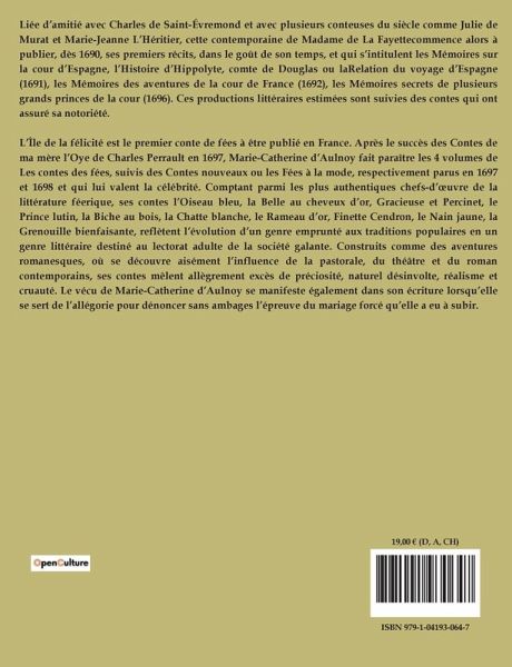 Liée d¿amitié avec Charles de Saint-Évremond et avec plusieurs conteuses du siècle comme Julie de Murat et Marie-Jeanne L¿Héritier, cette contemporaine de Madame de La Fayettecommence alors à publier, dès 1690, ses premiers récits, dans le goût de son temps, et qui s¿intitulent les Mémoires sur la cour d¿Espagne, l¿Histoire d¿Hippolyte, comte de Douglas ou laRelation du voyage d¿Espagne (1691), les Mémoires des aventures de la cour de France (1692), les Mémoires secrets de plusieurs grands princes de la cour (1696). Ces productions littéraires estimées sont suivies des contes qui ont assuré sa notoriété. L¿Île de la félicité est le premier conte de fées à être publié en France. Après le succès des Contes de ma mère l¿Oye de Charles Perrault en 1697, Marie-Catherine d¿Aulnoy fait paraître les 4 volumes de Les contes des fées, suivis des Contes nouveaux ou les Fées à la mode, respectivement parus en 1697 et 1698 et qui lui valent la célébrité. Comptant parmi les plus authentiques chefs-d¿¿uvre de la littérature féerique, ses contes l¿Oiseau bleu, la Belle au cheveux d¿or, Gracieuse et Percinet, le Prince lutin, la Biche au bois, la Chatte blanche, le Rameau d¿or, Finette Cendron, le Nain jaune, la Grenouille bienfaisante, reflètent l¿évolution d¿un genre emprunté aux traditions populaires en un genre littéraire destiné au lectorat adulte de la société galante. Construits comme des aventures romanesques, où se découvre aisément l¿influence de la pastorale, du théâtre et du roman contemporains, ses contes mêlent allègrement excès de préciosité, naturel désinvolte, réalisme et cruauté. Le vécu de Marie-Catherine d¿Aulnoy se manifeste également dans son écriture lorsqüelle se sert de l¿allégorie pour dénoncer sans ambages l¿épreuve du mariage forcé qüelle a eu à subir.