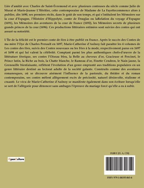 Liée d¿amitié avec Charles de Saint-Évremond et avec plusieurs conteuses du siècle comme Julie de Murat et Marie-Jeanne L¿Héritier, cette contemporaine de Madame de La Fayettecommence alors à publier, dès 1690, ses premiers récits, dans le goût de son temps, et qui s¿intitulent les Mémoires sur la cour d¿Espagne, l¿Histoire d¿Hippolyte, comte de Douglas ou laRelation du voyage d¿Espagne (1691), les Mémoires des aventures de la cour de France (1692), les Mémoires secrets de plusieurs grands princes de la cour (1696). Ces productions littéraires estimées sont suivies des contes qui ont assuré sa notoriété. L¿Île de la félicité est le premier conte de fées à être publié en France. Après le succès des Contes de ma mère l¿Oye de Charles Perrault en 1697, Marie-Catherine d¿Aulnoy fait paraître les 4 volumes de Les contes des fées, suivis des Contes nouveaux ou les Fées à la mode, respectivement parus en 1697 et 1698 et qui lui valent la célébrité. Comptant parmi les plus authentiques chefs-d¿¿uvre de la littérature féerique, ses contes l¿Oiseau bleu, la Belle au cheveux d¿or, Gracieuse et Percinet, le Prince lutin, la Biche au bois, la Chatte blanche, le Rameau d¿or, Finette Cendron, le Nain jaune, la Grenouille bienfaisante, reflètent l¿évolution d¿un genre emprunté aux traditions populaires en un genre littéraire destiné au lectorat adulte de la société galante. Construits comme des aventures romanesques, où se découvre aisément l¿influence de la pastorale, du théâtre et du roman contemporains, ses contes mêlent allègrement excès de préciosité, naturel désinvolte, réalisme et cruauté. Le vécu de Marie-Catherine d¿Aulnoy se manifeste également dans son écriture lorsqüelle se sert de l¿allégorie pour dénoncer sans ambages l¿épreuve du mariage forcé qüelle a eu à subir.
