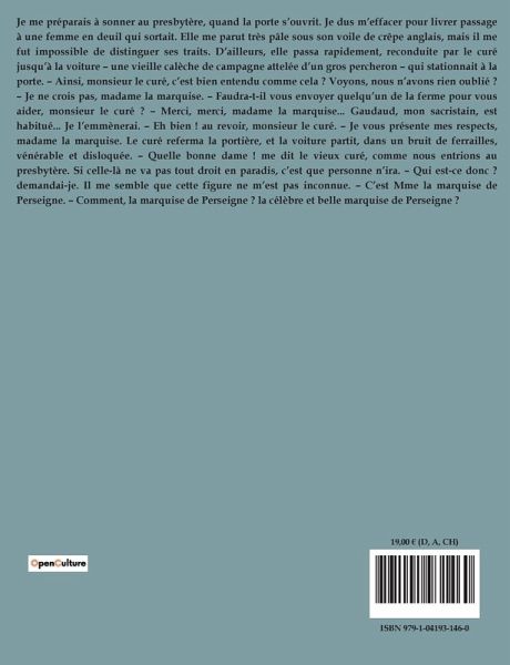 Je me préparais à sonner au presbytère, quand la porte s¿ouvrit. Je dus m¿effacer pour livrer passage à une femme en deuil qui sortait. Elle me parut très pâle sous son voile de crêpe anglais, mais il me fut impossible de distinguer ses traits. D¿ailleurs, elle passa rapidement, reconduite par le curé jusqüà la voiture ¿ une vieille calèche de campagne attelée d¿un gros percheron ¿ qui stationnait à la porte. ¿ Ainsi, monsieur le curé, c¿est bien entendu comme cela ? Voyons, nous n¿avons rien oublié ? ¿ Je ne crois pas, madame la marquise. ¿ Faudra-t-il vous envoyer quelqüun de la ferme pour vous aider, monsieur le curé ? ¿ Merci, merci, madame la marquise... Gaudaud, mon sacristain, est habitué... Je l¿emmènerai. ¿ Eh bien ! au revoir, monsieur le curé. ¿ Je vous présente mes respects, madame la marquise. Le curé referma la portière, et la voiture partit, dans un bruit de ferrailles, vénérable et disloquée. ¿ Quelle bonne dame ! me dit le vieux curé, comme nous entrions au presbytère. Si celle-là ne va pas tout droit en paradis, c¿est que personne n¿ira. ¿ Qui est-ce donc ? demandai-je. Il me semble que cette figure ne m¿est pas inconnue. ¿ C¿est Mme la marquise de Perseigne. ¿ Comment, la marquise de Perseigne ? la célèbre et belle marquise de Perseigne ?