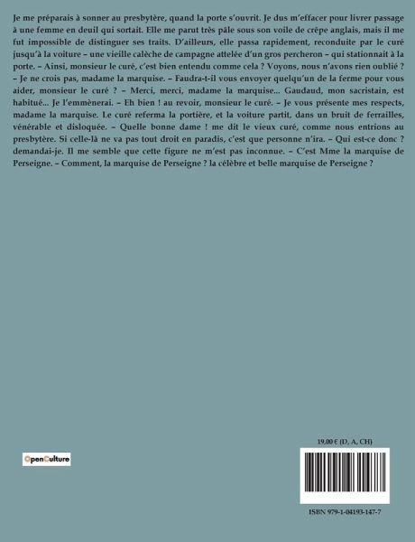 Je me préparais à sonner au presbytère, quand la porte s¿ouvrit. Je dus m¿effacer pour livrer passage à une femme en deuil qui sortait. Elle me parut très pâle sous son voile de crêpe anglais, mais il me fut impossible de distinguer ses traits. D¿ailleurs, elle passa rapidement, reconduite par le curé jusqüà la voiture ¿ une vieille calèche de campagne attelée d¿un gros percheron ¿ qui stationnait à la porte. ¿ Ainsi, monsieur le curé, c¿est bien entendu comme cela ? Voyons, nous n¿avons rien oublié ? ¿ Je ne crois pas, madame la marquise. ¿ Faudra-t-il vous envoyer quelqüun de la ferme pour vous aider, monsieur le curé ? ¿ Merci, merci, madame la marquise... Gaudaud, mon sacristain, est habitué... Je l¿emmènerai. ¿ Eh bien ! au revoir, monsieur le curé. ¿ Je vous présente mes respects, madame la marquise. Le curé referma la portière, et la voiture partit, dans un bruit de ferrailles, vénérable et disloquée. ¿ Quelle bonne dame ! me dit le vieux curé, comme nous entrions au presbytère. Si celle-là ne va pas tout droit en paradis, c¿est que personne n¿ira. ¿ Qui est-ce donc ? demandai-je. Il me semble que cette figure ne m¿est pas inconnue. ¿ C¿est Mme la marquise de Perseigne. ¿ Comment, la marquise de Perseigne ? la célèbre et belle marquise de Perseigne ?