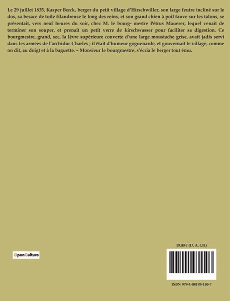 Le 29 juillet 1835, Kasper B¿ck, berger du petit village d¿Hirschwiller, son large feutre incliné sur le dos, sa besace de toile filandreuse le long des reins, et son grand chien à poil fauve sur les talons, se présentait, vers neuf heures du soir, chez M. le bourg- mestre Pétrus Mauerer, lequel venait de terminer son souper, et prenait un petit verre de kirschwasser pour faciliter sa digestion. Ce bourgmestre, grand, sec, la lèvre supérieure couverte d¿une large moustache grise, avait jadis servi dans les armées de l¿archiduc Charles ; il était d¿humeur goguenarde, et gouvernait le village, comme on dit, au doigt et à la baguette. ¿ Monsieur le bourgmestre, s¿écria le berger tout ému.