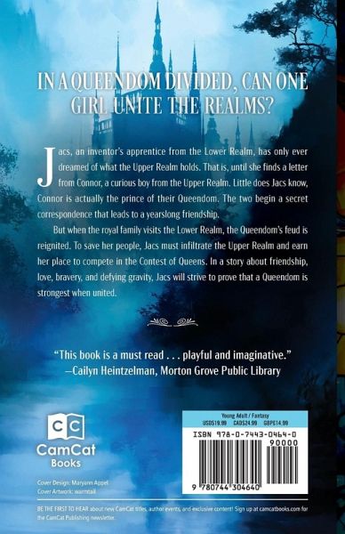 In a Queendom divided, can one girl unite the realms? Jacs, an inventor's apprentice from the Lower Realm, has only ever dreamed of what the land among the clouds holds. That is until she finds a letter from Connor, an Upperite boy hoping to learn more about the land below. Little does Jacs know, Connor is actually Prince Cornelius of the Queendom of Frea. With wooden boats and hot air balloons, the two begin a secret correspondence. But their friendship is divided by a heavily-guarded bridge and an inescapable prejudice. The strength of their bond was thought to transcend distance and time, but when the royal family visits the Lower Realm, the Queendom's feud is reignited. To save her people, Jacs must infiltrate the Upper Realm and earn her place to compete in the Contest of Queens. In a story about friendship, love, bravery, and defying gravity, Jacs will strive to prove that a Queendom is strongest when united. "This book is a must read . . . playful and imaginative." -Cailyn Heintzelman, Morton Grove Public Library