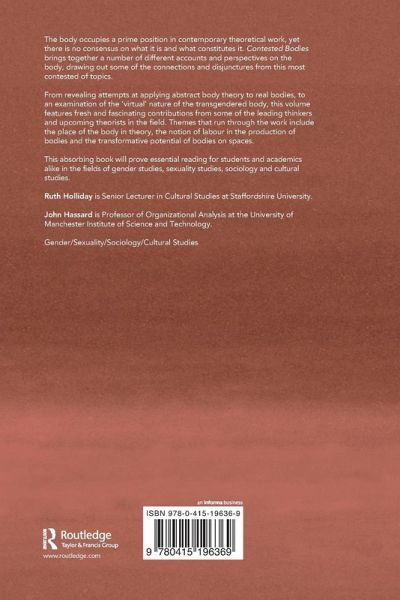 The body occupies a prime position in contemporary theoretical work, yet there is no consensus on what it is and what constitutes it. Contested Bodies brings together a number of different accounts and perspectives on the body, drawing out some of the key connections and disjunctures from this most contested of topics. From revealing attempts at applying abstract body theory to real bodies, to an examination of the consumption of princess's bodies in popular culture and thoughts on the 'virtual' nature of the transgendered body, this volume features fresh and fascinating contributions from some of the leading thinkers and upcoming theorists in the field. Themes that run through the work include the place of the body in theory, the notion of labour in the production of bodies and the transformative potential of bodies on spaces. Contributors include: David Bell; Gargi Bhattacharyya; Richard Collier; Mark Featherstone; Ruth Holiday; Lynda Johnston; Robyn Longhurst; Leslie J. Moran; Sally R. Munt; John O'Neill; Diane Roberts; Karen Stevenson; Graham Thompson and Stephen Whittle