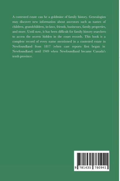 A contested estate can be a goldmine of family history. Genealogists may discover new facts about their ancestors such as names of children, grandchildren, in-laws, friends, businesses, family properties and more. Until now, it has been difficult for family history searchers to access the secrets hidden in court records. Here you will find a complete record of every name mentioned in a contested estate in Newfoundland between 1817, when case reports first began in Newfoundland, and 1949 when it became Canada's tenth province. There are more than 800 individuals mentioned over the course of 187 cases. Each court case is listed individually with the date of the case, the name of the deceased, and the names of every person mentioned in the case. There is also a brief summary of why the estate was before the courts.
