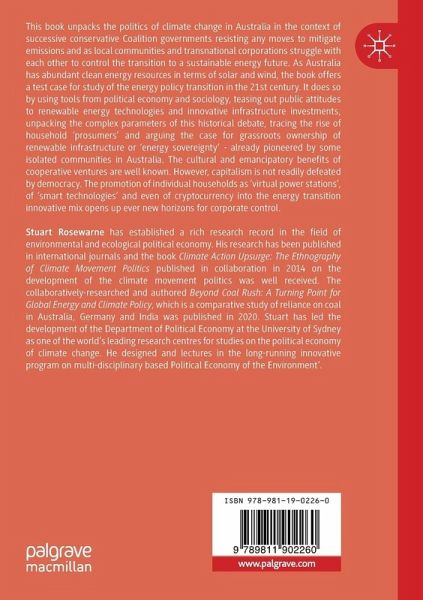 This book unpacks the politics of climate change in Australia in the context of successive conservative Coalition governments resisting any moves to mitigate emissions and as local communities and transnational corporations struggle with each other to control the transition to a sustainable energy future. As Australia has abundant clean energy resources in terms of solar and wind, the book offers a test case for study of the energy policy transition in the 21st century. It does so by using tools from political economy and sociology, teasing out public attitudes to renewable energy technologies and innovative infrastructure investments, unpacking the complex parameters of this historical debate, tracing the rise of household 'prosumers' and arguing the case for grassroots ownership of renewable infrastructure or 'energy sovereignty' - already pioneered by some isolated communities in Australia. The cultural and emancipatory benefits of cooperative ventures are well known. However,capitalism is not readily defeated by democracy. The promotion of individual households as 'virtual power stations', of 'smart technologies' and even of cryptocurrency into the energy transition innovative mix opens up ever new horizons for corporate control.