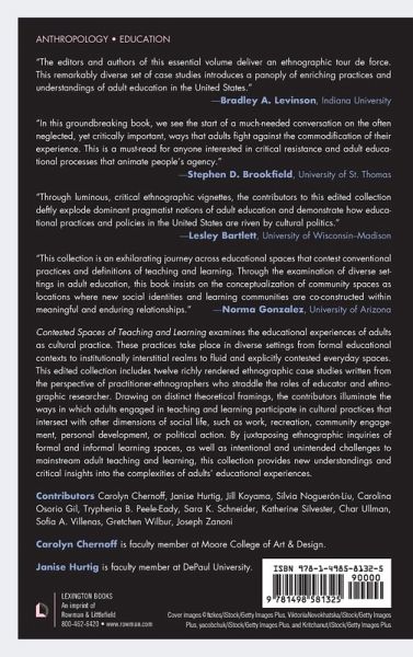 Introduction: Contesting Adult Education Carolyn Chernoff and Janise Hurtig Section 1-Contesting Curriculum: Teaching and Learning in Community Education Spaces Chapter 1: Maps, Flyers, and Notebooks: The Materiality of Experts and Novices in Refugee Education Jill Koyama Chapter 2: Rethinking Digital Resources in Adult and Family Literacy: Immigrant Parents' Perspectives in Digital Literacy Program Silvia Noguerón-Liu Chapter 3: A Space Within a Space Janise Hurtig Section 2-Contesting Contexts: Teaching and Learning in Institutional Spaces Chapter 4: Insider Yoga: Bodily Cultivation in Yoga at the River, a Hermetic Male Prison Yoga Community Sara K. Schneider Chapter 5: The Call to Wisdom: Warm Demander Pedagogy and the Black Church Sunday School Teacher as Learner Tryphenia B. Peele-Eady Chapter 6: Every Voice Matters: Taking Action for Equity Gretchen Wilbur Chapter 7: Organizers Leading Learning: Transforming Training at the Latino Union Workers Center Joseph Zanoni Section 3- Contesting Community: Teaching and Learning in and across Public Spaces Chapter 8: "All I Want Is to Breathe. . . . Won't You Breathe with Me?" The Individual and the Collective in an LGBTQ and Allies Community of Practice Char Ullman Chapter 9: Latinx Cultural Programming as Public Pedagogy: Mobilizing Cultura (Culture) in a Small Town Community in Upstate New York Sofia A. Villenas and Carolina Osorio Gil Chapter 10: Transnational Lives and Lifelong Learning in Mutual Assistance Katherine Silvester Chapter 11: Identity On Parade: Teaching and Learning Race, Class, Gender, and Sexuality in Public Carolyn Chernoff Index About the Editors and Contributors