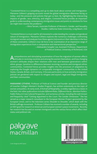 "Contested Voices is a compelling and up-to-date book about women and immigration. Marianne Githens' gripping accounts reveal the global immigration dilemmas facing us today and the pressures and policies that got us here. By highlighting the intersecting impacts of gender, race, ethnicity, and religion, Contested Voices provides an important guide to understanding contemporary immigration issues and points to solutions for how we might best resolve the problems." - Shira Tarrant, Associate Professor of Women's, Gender, and Sexuality Studies, California State University, USA