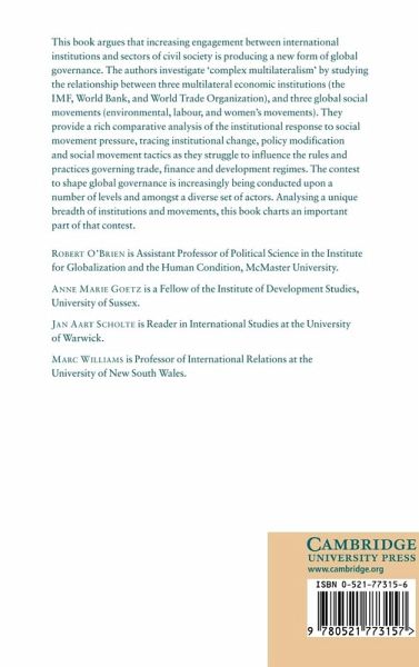 The contest to shape global governance is increasingly being conducted on a number of levels and among a diverse set of actors. This book argues that increasing engagement between international institutions and sectors of civil society is producing a new form of international organization. The authors study the relationship between the IMF, World Bank, and World Trade Organisation, and environmental, labor, and women's movements, providing a rich analysis of the institutional response to social movement pressure.