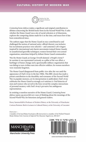 Contesting home defence is a new history of the Home Guard, a novel national defence force of the Second World War composed of civilians who served as part-time soldiers: it questions accounts of the force and the war, which have seen them as symbols of national unity. It scrutinises the Home Guard's reputation and explores whether this 'people's army' was a site of social cohesion or of dissension by assessing the competing claims made for it at the time. It then examines the way it was represented during the war and has been since, notably in Dad's Army, and discusses the memories of men and women who served in it. The book makes a significant and original contribution to debates concerning the British home front and introduces fresh ways of understanding the Second World War.