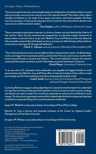 During war, space for debate shrinks. Narrow ideas of patriotism and democracy marginalize and silence opposition to militarism abroad and repression at home. Although powerful, these ideas encounter widespread resistance. Analyzing the official statements of 15 organizations from 1990-2005, the authors show that the U.S. peace movement strongly contested taken-for-granted assumptions regarding nationalism, religion, security, and global justice. Contesting Patriotism engages cutting-edge theories in social movements research to understand the ways that activists promote peace through their words. Concepts of culture, power, strategy, and identity are used to explain how movement organizations and activists contribute to social change. The diversity of organizations and conflicts studied make this book a unique and important contribution to peace building and to social movements scholarship.