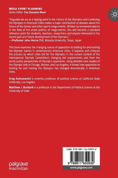 This book examines the changing nature of opposition to bidding for and hosting the Olympic Games in contemporary American cities. It explores and critiques the process by which cities bid for the Olympics in the current context of the International Olympic Committee's changing bid requirements and from the social justice perspectives of Olympics opponents. Using detailed case studies of the Olympic bids in Chicago, Boston, and Los Angeles, it shows how opposition to bidding for and hosting the Olympics has changed dramatically in American cities.